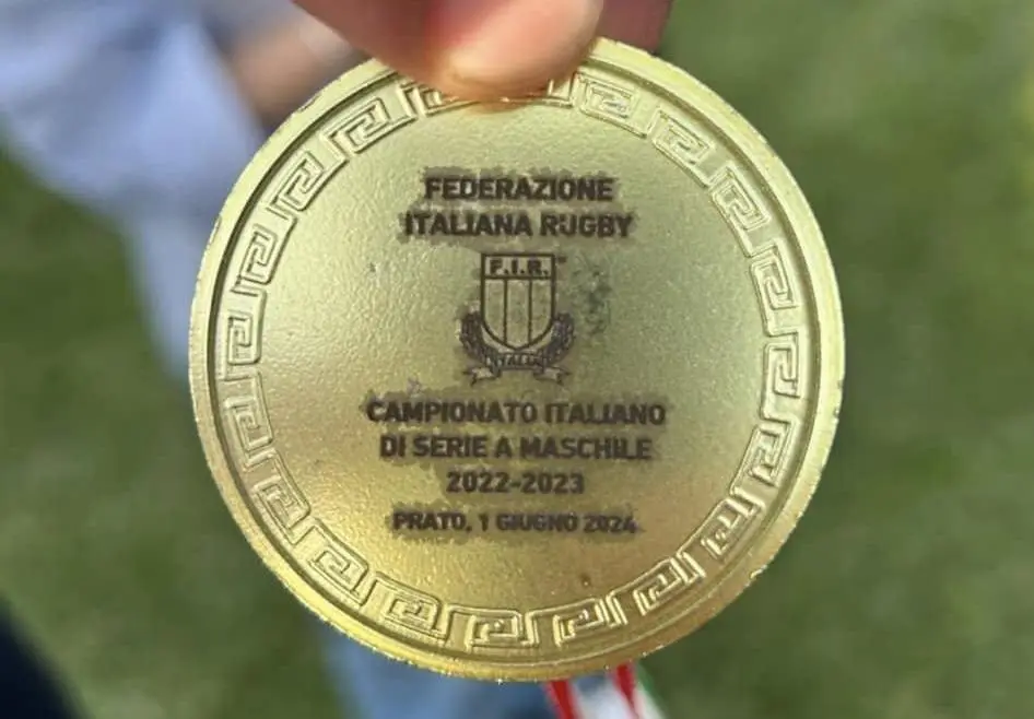 La premiazione si è trasformata in una beffa. La foto qui sopra mostra la medaglia celebrativa consegnata ai giocatori della Lazio per la vittoria 26-23 ottenuta nello spareggio promozione di Serie A contro il Cus Torino e la conseguente promozione in Serie A Elite per la prossima stagione 2024/25. Come si vede riporta scritto "Campionato italiano maschile di Serie A 2022/23". Cioè quello della scorsa stagione agonistica. E non Serie A 2023/24, cioè quella l'attuale. Sotto invece la data e la località dove si è disputata la partita sono corrette: Prato 1° giugno 2024.
