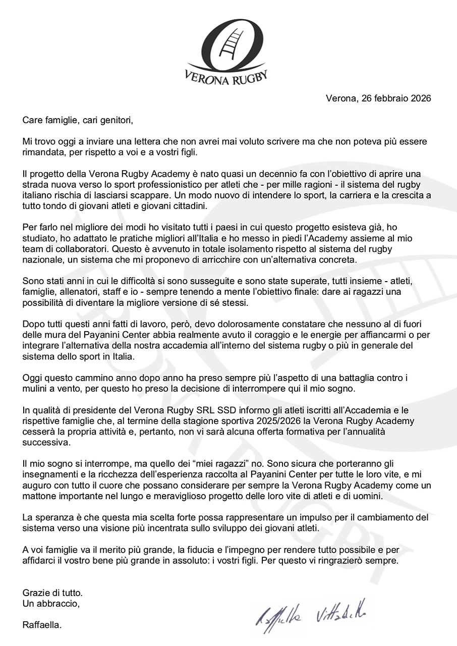 Ultimo in ordine di tempo Verona, secondo in Serie A1 con ambizioni di promozione, sede di una prestigiosa Academy giovanile e degli allenamenti dell'Italia in vista del Sei Nazioni al Payanini Center. La sua presidente Raffaella Vittadello ha annunciato oggi la chiusura della società con una lettera aperta e con una lettera alle famiglie dell'Academy. Le riportiamo integralmente entrambe.