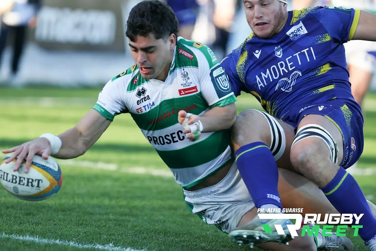 Subito dopo ancora Tommaso Menoncello trova il break, palla per Matt Gallagher, infine offload per Paolo Odogwu che va a segno… ma ancora una volta TMO: Mendy trattiene Marco Zanon, lasciando spazio a Menoncello, terza meta annullata del match.