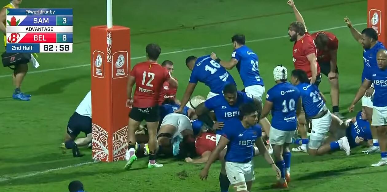Samoa aveva bisogno di una scarica di energia per segnare la sua prima meta, e quella scossa è arrivata quando Tusi Pisi ha messo in campo Abraham Papali'i. Una corsa di Tuitama ha aiutato i Manu Samoa a entrare nei 22 metri belgi, permettendo al pacchetto di mischia samoano di mettersi al lavoro. Dopo pazienza e determinazione, Abraham Papali’i ha deciso di prendere l’iniziativa, travolgendo un difensore per segnare la prima meta del match.