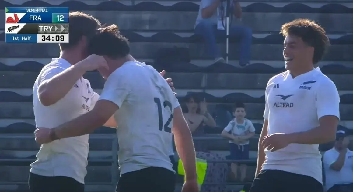 Primo tempo equilibrato ma molto intenso tra Baby Blacks e Francia, nella semifinale giocata a Viadana. I neozelandesi vanno subito in vantaggio dopo tre minuti con Solomon. Al 10' arriva il raddoppio con Mason. La Francia si rifà sotto con le marcature di Gourgoues e Britz. Primo tempo che si chiude 19-24. Nella ripresa la Nuova Zelanda mantiene il vantaggio nonostante i gialli a Wisemann e Veanuku. Nel finale la marcatura di Vakaisuola manda i neozelandesi in finale.